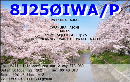 愛知県岩倉市の市制50周年を記念する特別局、8J250IWA局と40m, FT8で交信できました。本特別局は、2021年10月1日から12月5日まで、岩倉アマチュア無線クラブによる運用です。QSLカードはビューロ経由のOne Wayとのこと。先日のQSOに対してはeQSLを発行いただきました。詳しい情報はQRZ.com (8J250IWA)からどうぞ。私はいち岩倉市民として8J250IWA局を応援します。