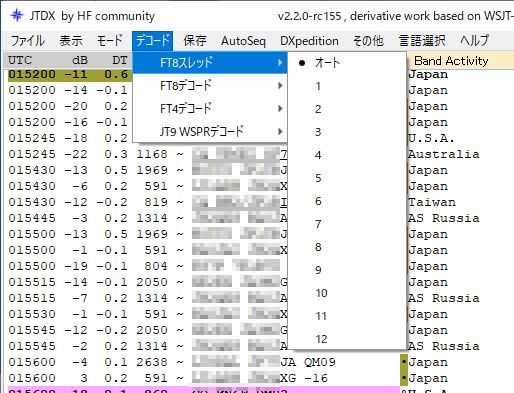 デコード設定はデコードメニューから簡単に設定できるようになっています。4コア、8スレッドのCPUのパソコンを使っているため、FT8スレッドを8にした場合と、オートの場合で比べてみると、オート設定の方がデコード率が良かった、という結果でした。スレッド数に合わせて設定した方が良いとの情報もありましたが、簡単に比較できますので皆様のそれぞれの環境でご確認されることをお勧めします。