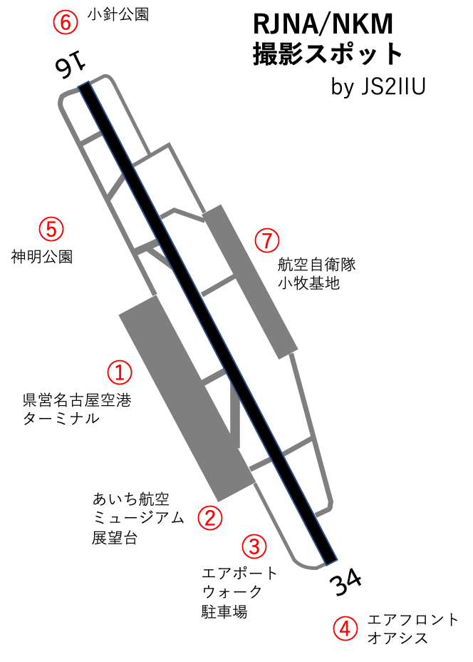 | ③エアポートウォーク駐車場 | RW34アプローチの見通し良好、タッチダウンポイント至近 RW34へのタキシング超至近、パイロットの顔が見える距離 フェンスが高いため、脚立必要。もしくはフェンスの隙間から狙う RW16使用時の離陸は撮影困難 | ○ 無料 | △ |