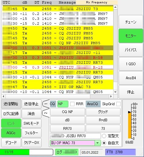 当局はCQ NPのパターンで飛び出し送信していました。JTDXを使っているためCQ NYPが設定できなかったのが主な理由ですが、よりピックアップしてもらえたら・・・とも思っています。「規約の電信に準じて、との記載読んでないのか?従わないのはルール違反!」と言いたい方がおられるかもしれませんね。ごめんなさい、でもJTDXを使いこなせてないんです。