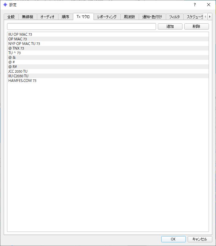 JTDXでは自由文の機能で好きな文字列を送ることができます。【ファイル】→ 【設定】で設定を開き、Tx マクロタブを表示させます。 よくわからずにいろいろと追加してしまっていますが、大事なのは、今回使いたいものを一番上に持ってきておく、ということです。この設定画面ではドラッグアンドドロップで順番の入れ替えが簡単にできます。交信中にプルダウンから選択するのは非常に手間で、オペレーションが乱れるのでお勧めできません。