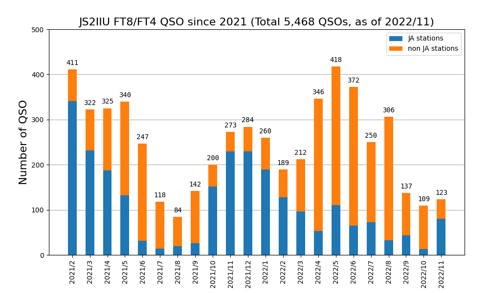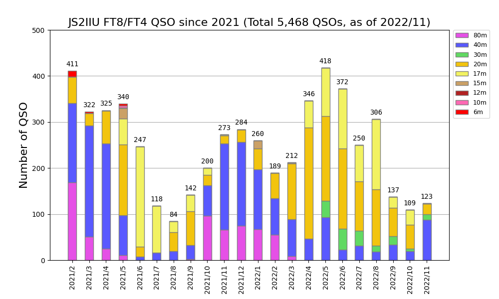 開局以来のFT8運用でのQSO件数は5,468件。年末までに5,500QSOに到達できそうな見込みです。改めて交信していただいた局長の皆様に感謝です。