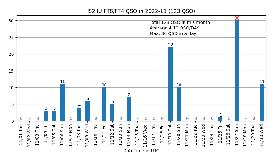 11月は先月と比べると若干交信件数が増えたものの、アクティビティ低調。7MHz/40mの運用を増やしました。色々と億劫で、アンテナの交換作業をなるべくしないようにしていたのが原因です。当局のアンテナは戸建ての2階ベランダにモービルを立てているだけのシンプルな設備となっています。モノバンドのモービルアンテナを取っ替え引っ替えする運用スタイルです。