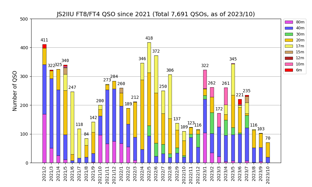 気持ちいい季節になってしまいましたので、無線以外のアクティビティが増えてしまいました。その結果QSOの数は少なくなってしまいました。平日帰宅後のQSOも全く振るわず。