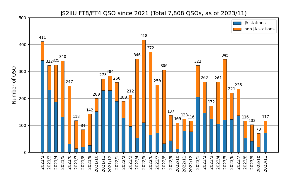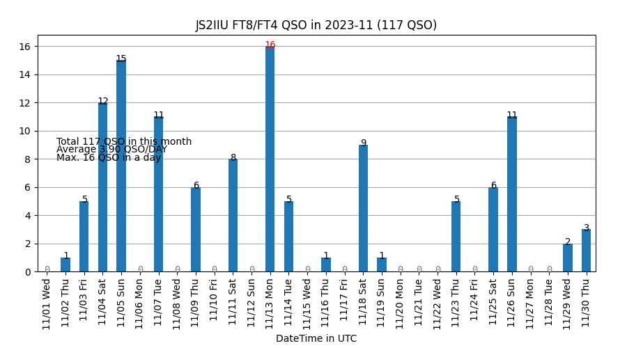 相変わらず平日の無線活動は振るわずでしたが楽しい無線生活を送ることができています。11月は国内80mが好調でした。冬は80mが盛ん?過去の状況見るとそんな傾向です。アンテナの取り替えが億劫な季節です。UHV-9でなるべく多くのバンドに出たいと思います。