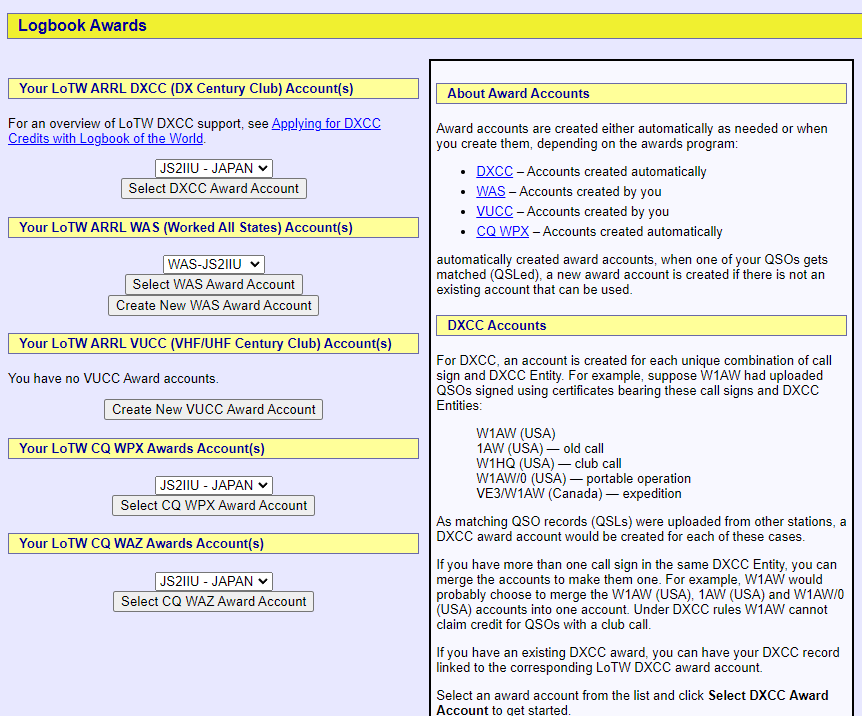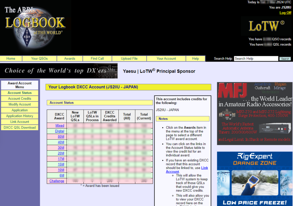 QRZ.comはオンラインログの作成とコールサインごとにホームページを作ることができます。オンラインログはLoTWから読み込みかADIFのアップロードで作成&更新可能。さらにQRZ.comのオリジナルアワードを獲得することができます。簡単に獲得できるものから、難易度高いものまで揃っています。