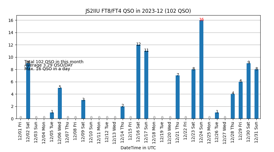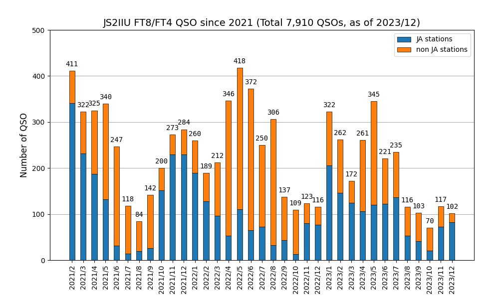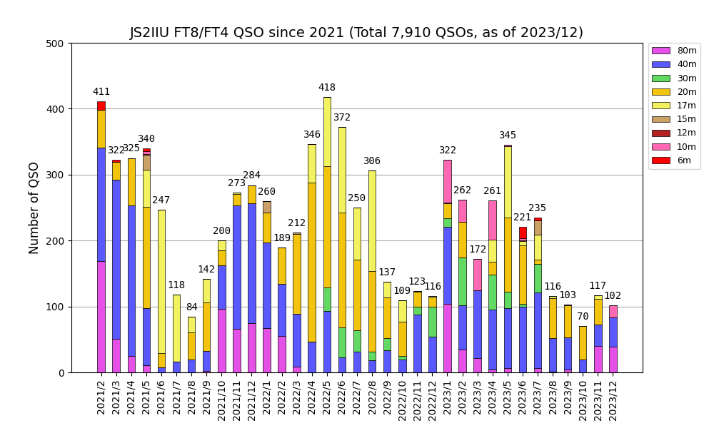 12月jはギリギリ3桁到達でした。今月も3.5MHzが好調です。日によって3.5MHz帯にひどいノイズが乗ることもありますが、アクティブに出られている局が多い印象です。年明けはアンテナを交換して10m、20mあたりに出てみようと思います。