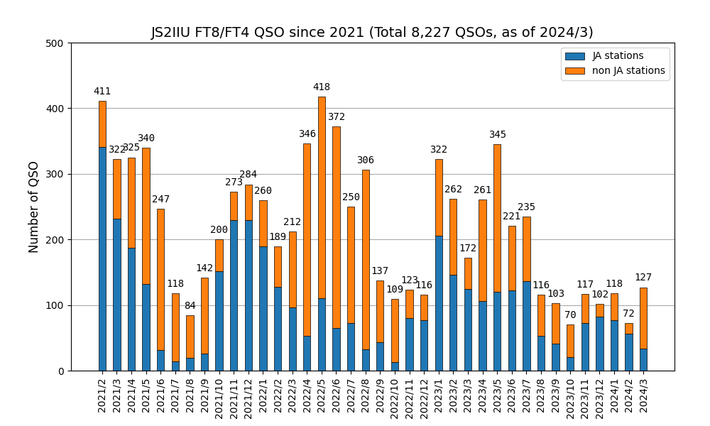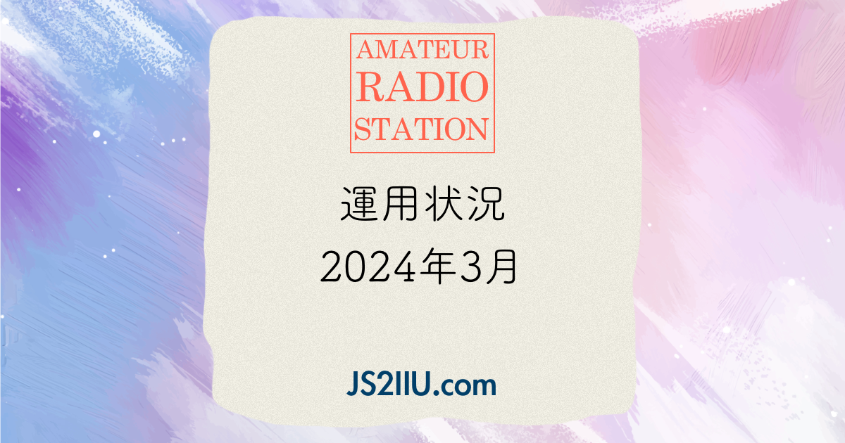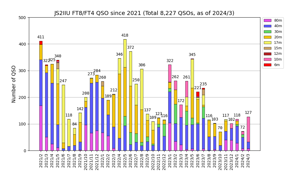 2024年3月は127QSOでした。今月は28MHzが大変調子良く、28MHzにこだわって運用してみました。28MHzでは時間帯によりますがヨーロッパ方面も南半球も、北米方面も交信できてやりがいあるバンドだと実感しました。