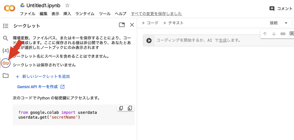 まずはGoogleCoabにアクセスします。左端のツールアイコンの鍵マークのところをクリックします。(赤矢印)以下の画面が表示されると思います。