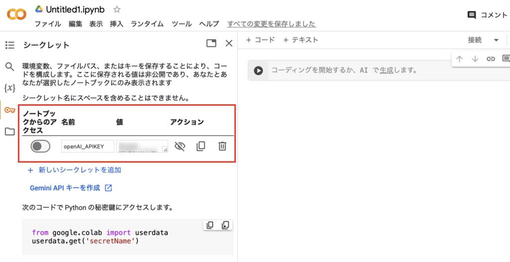 次に、シークレットをGoogle Colabの環境に追加します。これは一度設定すれば、ノートブックのセッション内で使用可能です。
