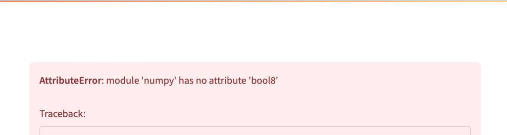 二つ目は、AttributeError: module 'numpy' has no attribute 'bool8' というエラーが出た場合です。エラーはこちらのようなものだと思います。