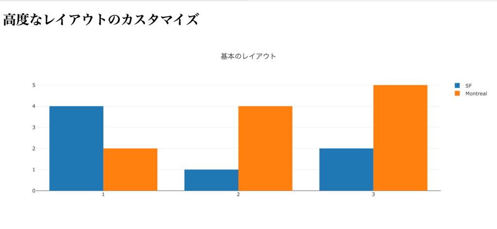 このプログラムでは、ページにタイトルと棒グラフを表示します。グラフは2つのデータセットを持ち、それぞれ「SF」と「Montreal」という名前で表示されます。Dashを使うことで、インタラクティブなデータビジュアライゼーションを簡単に作成できることがわかります。
