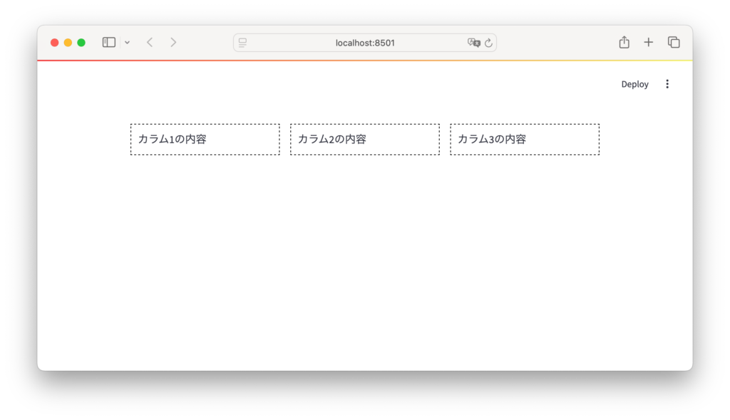 以下のコードで、3つの均等なカラムを作成し、それぞれに異なる内容を配置しています。カラムの外枠は点線で表示され、レイアウトを視覚的にわかりやすくしています。