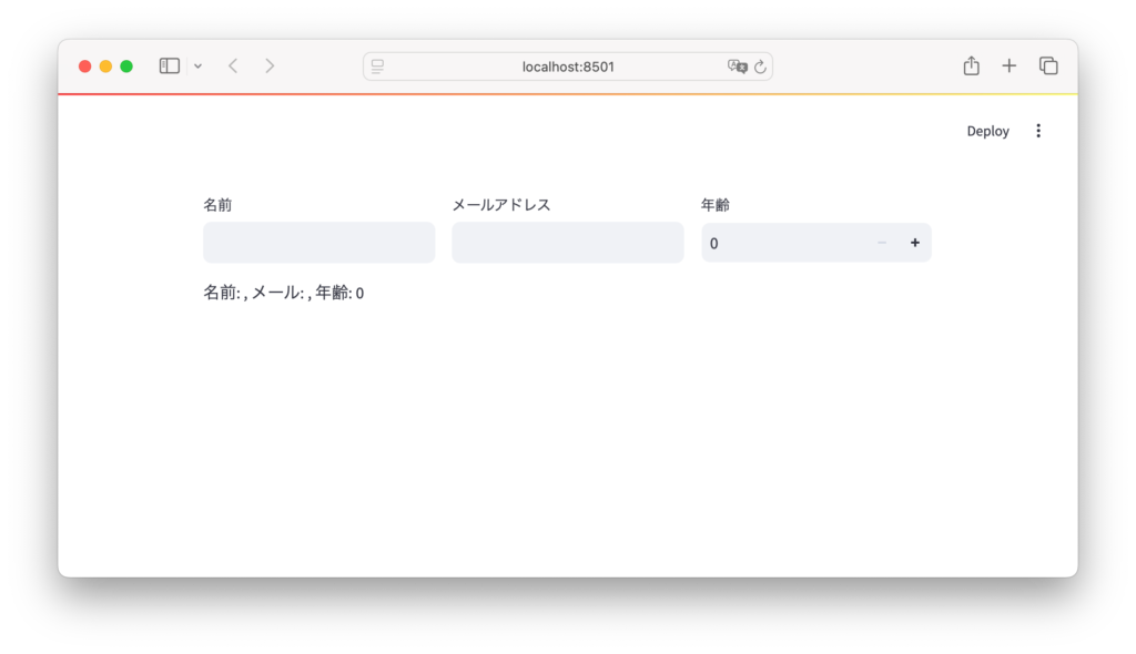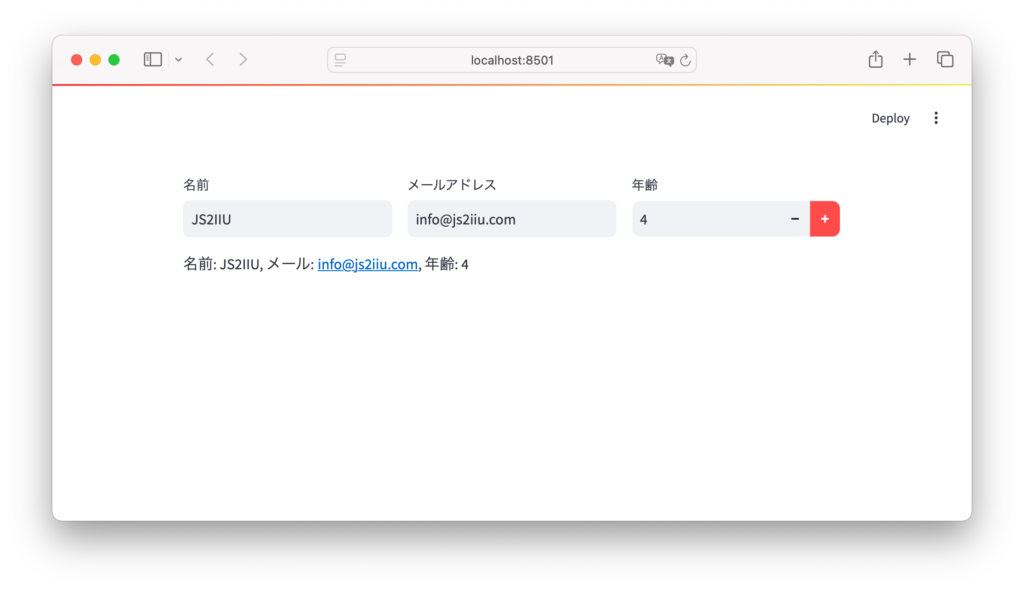 st.write(f"名前: {name}, メール: {email}, 年齢: {age}")