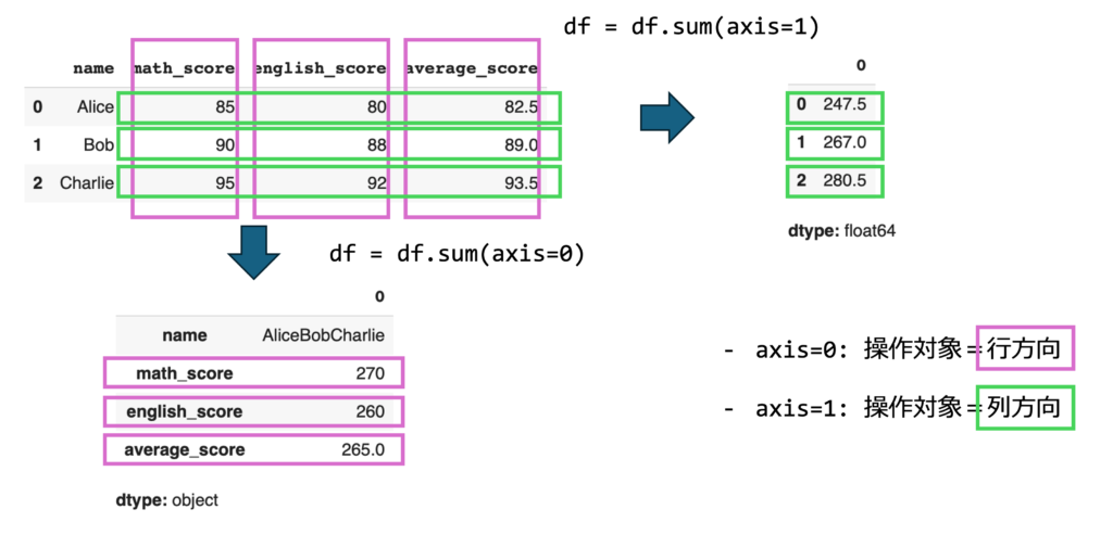 axis=0:操作対象が「行」方向(垂直)axis=1:操作対象が「列」方向(水平)