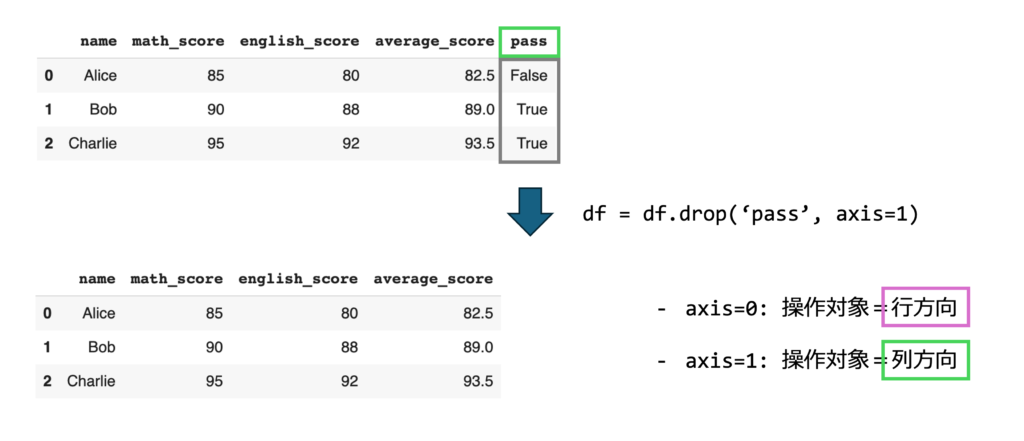 .dropメソッドのaxisパラメータは、削除対象が「行」か「カラム」かを指定します: