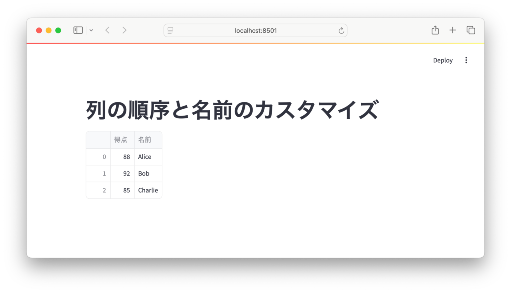df = pd.DataFrame({"名前": ["Alice", "Bob"], "得点": [85, 90]})