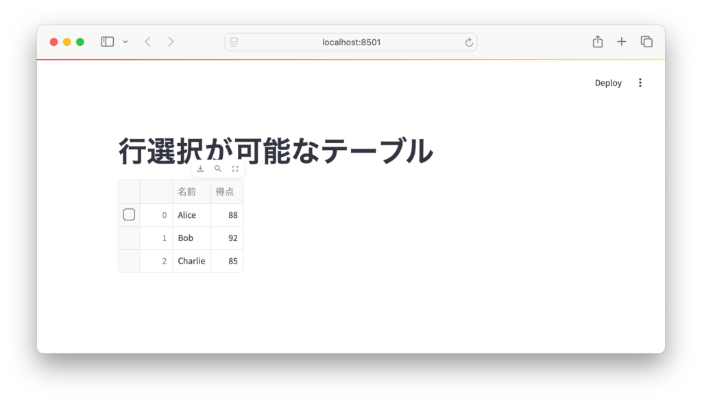 st.dataframeを使うと、DataFrameや類似のデータ構造を以下の特徴を持つテーブルとして表示できます。