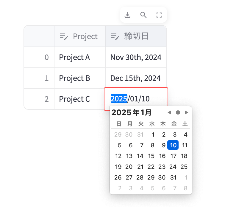 st.data_editorを使用し、column_configで設定したカスタマイズを適用してデータフレームを表示します。- ユーザーはカレンダー形式で日付を編集できます。