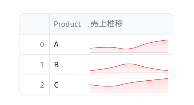 AreaChartColumnは、データフレーム内の列をエリアチャートとしてレンダリングするために使用します。各セルのデータをチャートとして描画するため、情報がより分かりやすくなり、データの動向を視覚的に確認することが可能です。