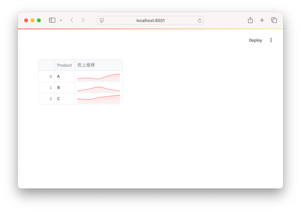 st.dataframeにカスタム設定を渡し、エリアチャート付きのデータフレームを生成。