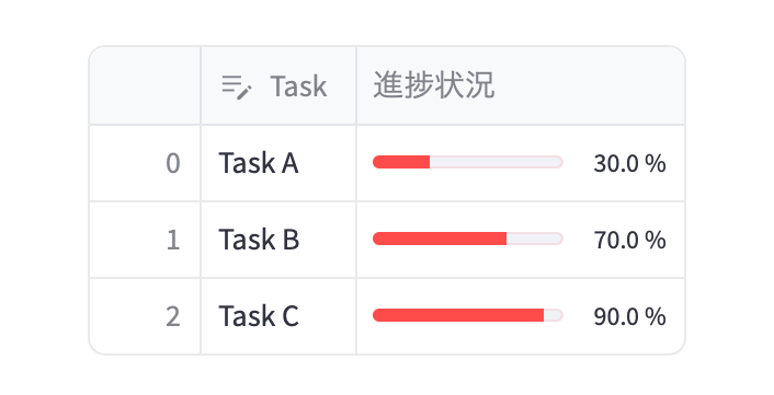 各タスクの進捗率(0~100%)を含むデータフレームを作成。 - ProgressColumnの設定