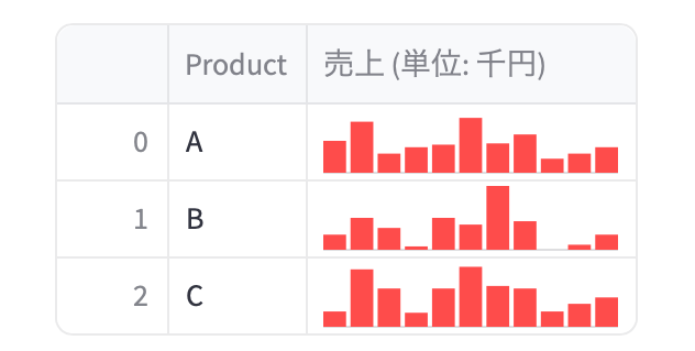 Streamlitでは、データフレーム内のデータをカスタマイズして表示するための便利な設定が多数提供されています。st.column_config.BarChartColumnは、その一つで、カテゴリ別データを棒グラフ形式で視覚化するためのクラスです。