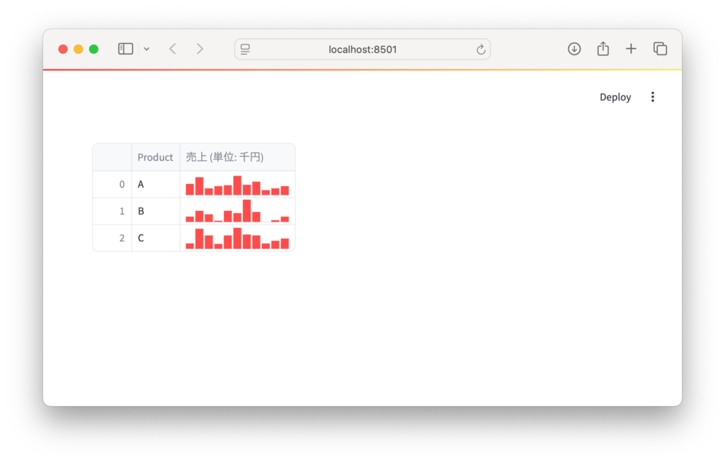 st.dataframeにcolumn_configを渡すことで、指定した列を棒グラフとして表示します。