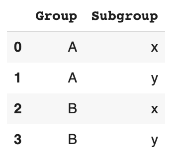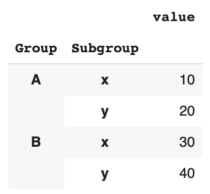 index = pd.MultiIndex.from_product([['A', 'B'], ['x', 'y']], names=['Group', 'Subgroup'])