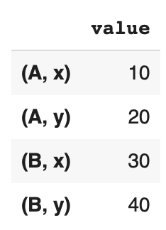 index = pd.MultiIndex.from_tuples([('A', 'x'), ('A', 'y'), ('B', 'x'), ('B', 'y')],