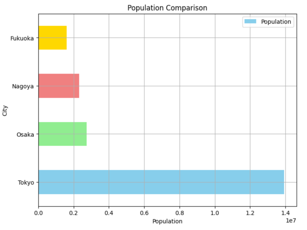 df.plot.barh()メソッドで水平棒グラフを作成します。x='Population'でx軸に’人口’列を使用することを指定します。y='City'でy軸に’都市’列を使用することを指定します。figsize=(8, 6)でグラフのサイズを指定します。title='Population Comparison'でグラフのタイトルを指定します。
