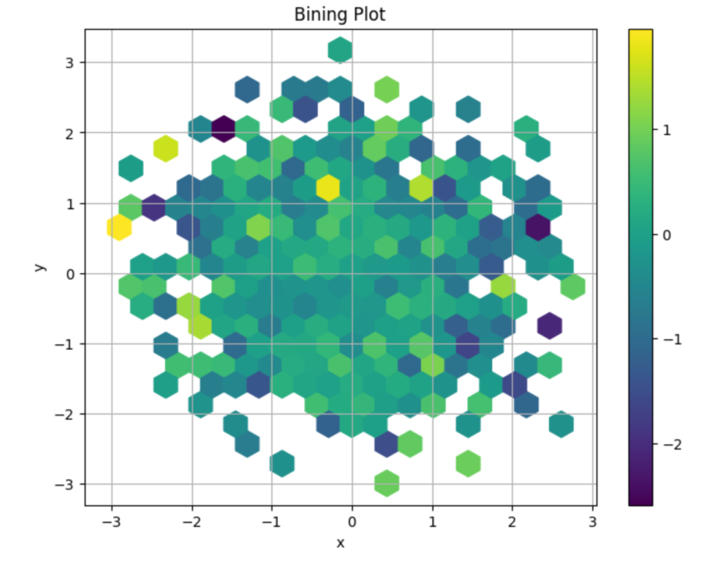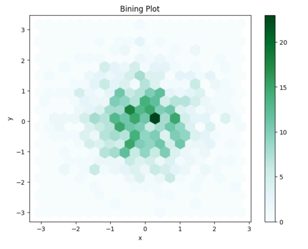 ビニングプロットは、散布図に似たグラフですが、2つの変数の関係を六角形のビンで表現します。各ビンは、データ空間を分割した小さな領域を表し、ビン内のデータポイントの数を色で表します。 これにより、データの密度や分布を視覚的に把握することができます。特に、大量のデータポイントを扱う場合に、散布図よりも効果的にデータの傾向を把握できます。