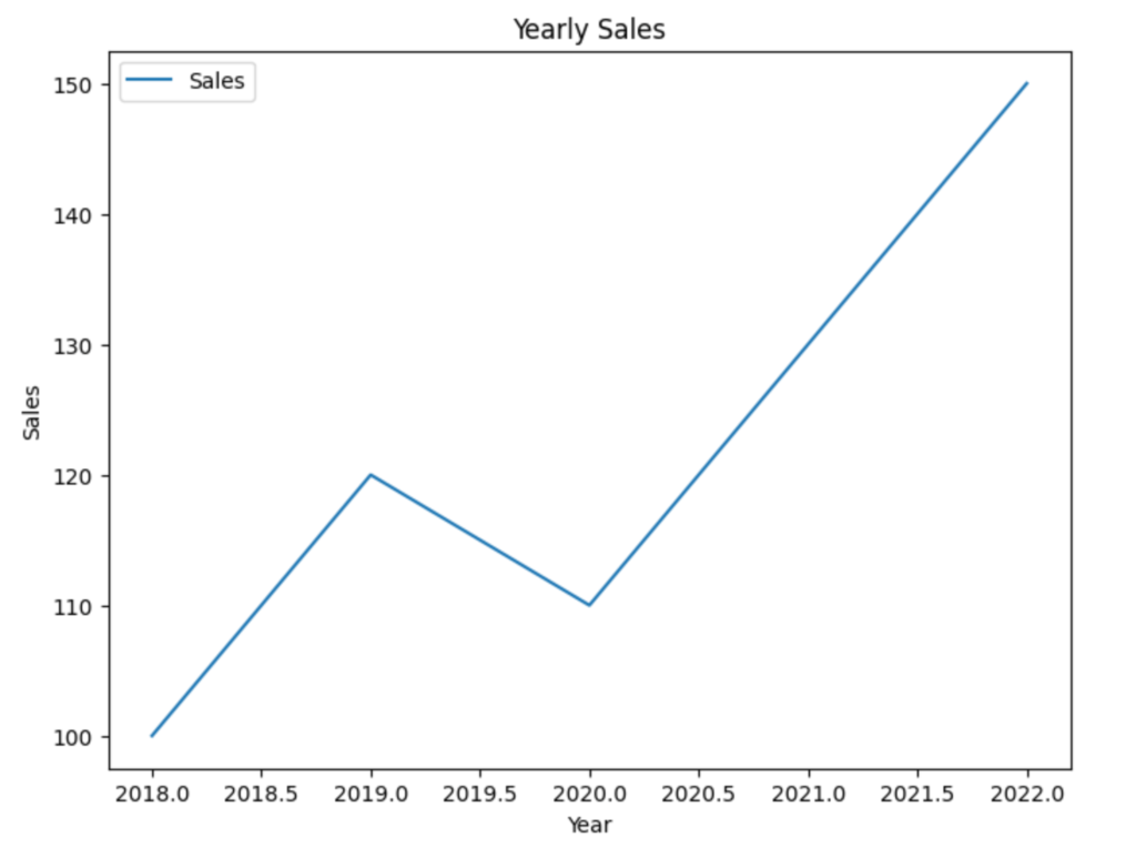 df.plot.line()メソッドで折れ線グラフを作成します。x='Year'でx軸に’年’列を使用することを指定します。y='Sales'でy軸に’売上’列を使用することを指定します。figsize=(8, 6)でグラフのサイズを指定します。title='年間売上推移'でグラフのタイトルを指定します。