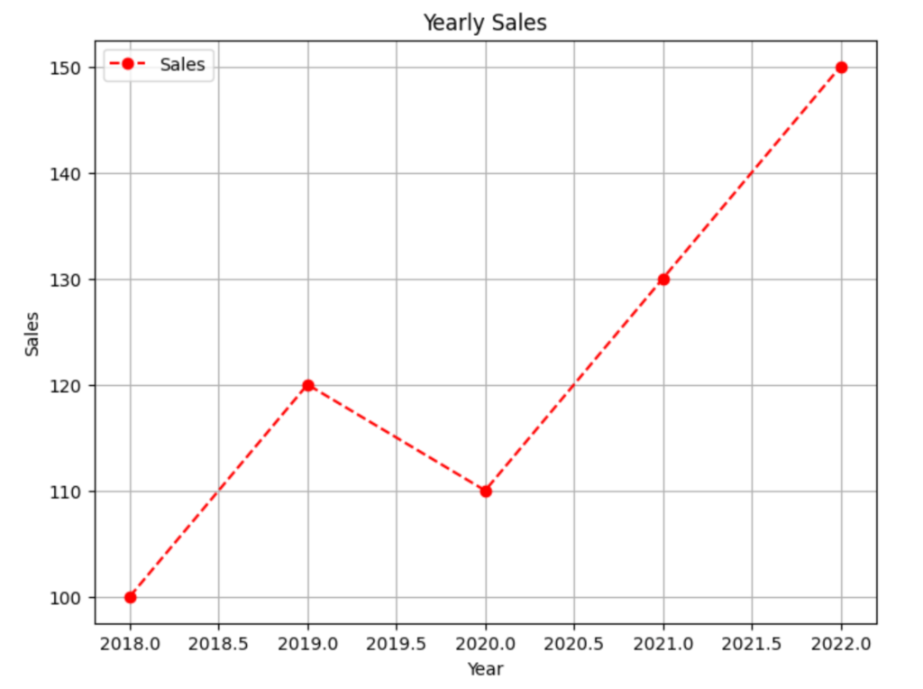 marker='o'でデータポイントに円形のマーカーを表示しています。linestyle='--'で線種を破線に設定しています。color='red'で線の色を赤に設定しています。grid=Trueでグリッド線を表示しています。