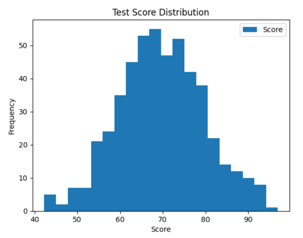 df = pd.DataFrame({'Score': np.random.normal(70, 10, 500)})