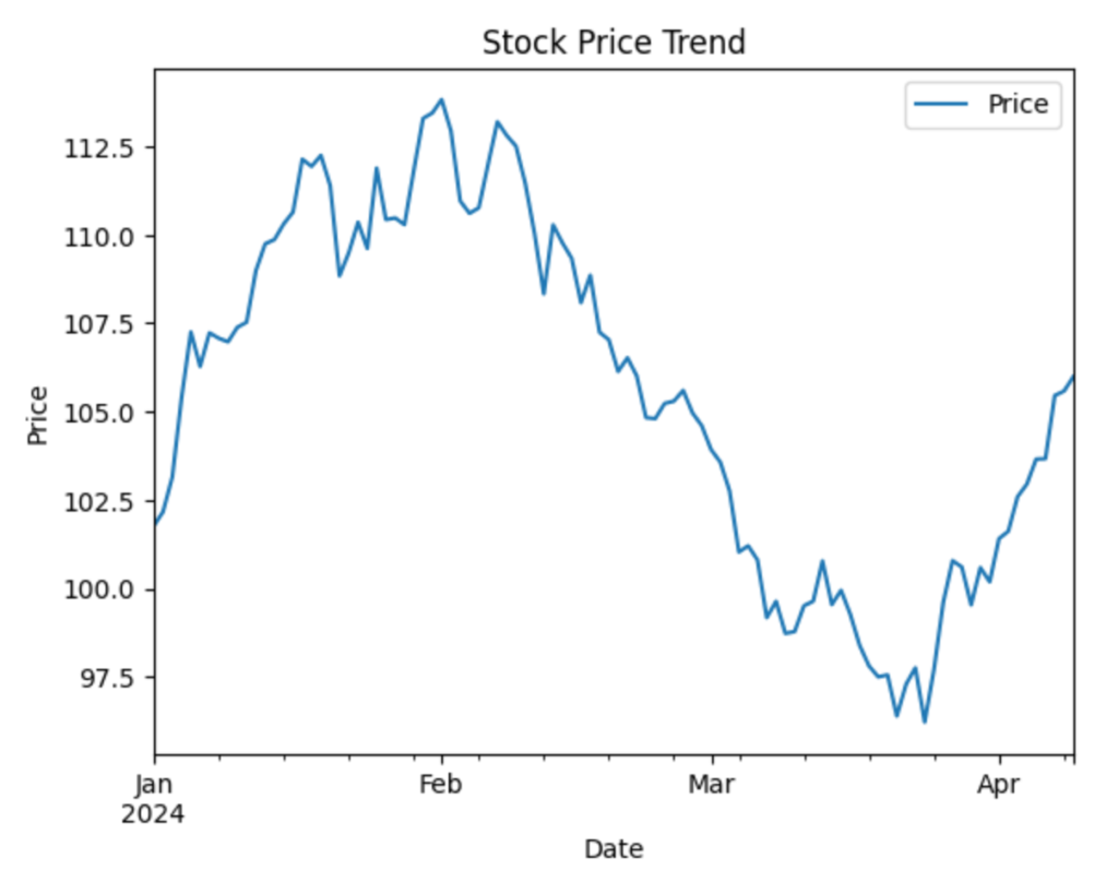 pd.date_range('2024-01-01', periods=100, freq='D')で、2024年1月1日から始まる100日分のDatetimeIndexを生成し、’Date’列に代入しています。100 + np.random.randn(100).cumsum()で、ランダムな値の累積和を計算し、株価の推移をシミュレートしています。df.set_index('Date', inplace=True)で、’Date’列をインデックスに設定しています。df.plot.line()で折れ線グラフを作成します。