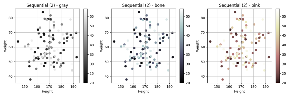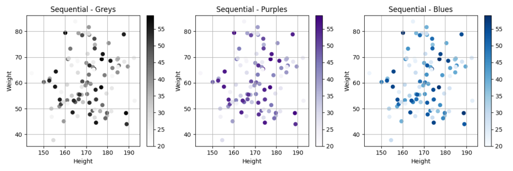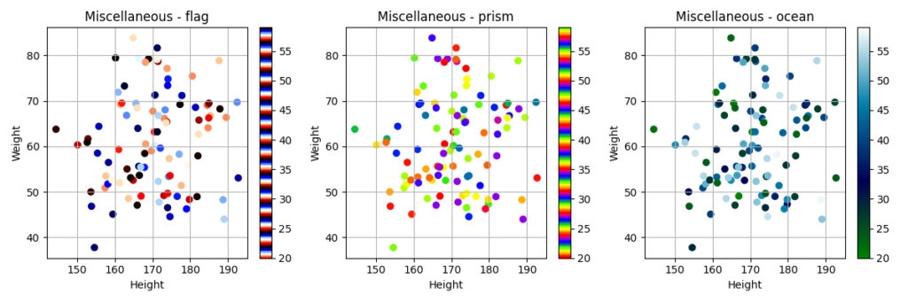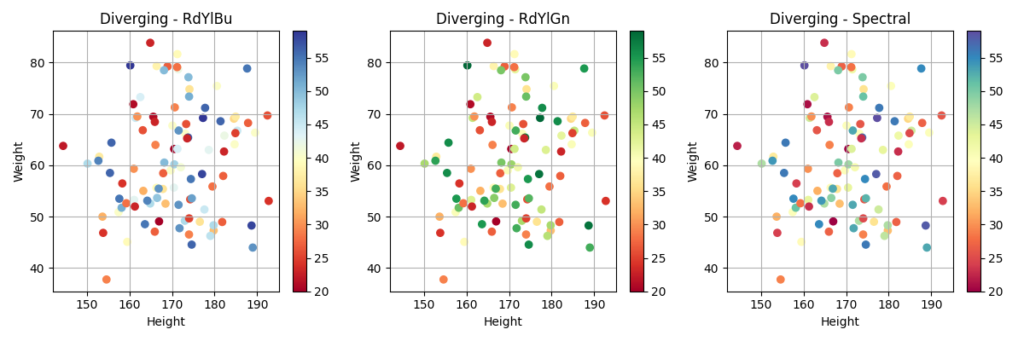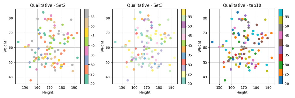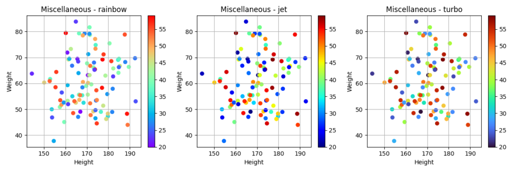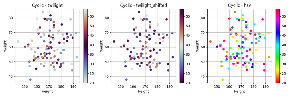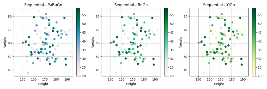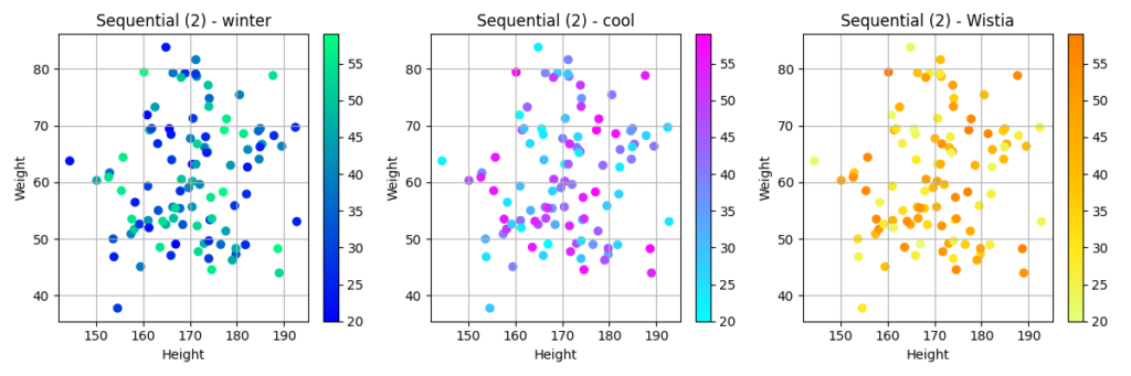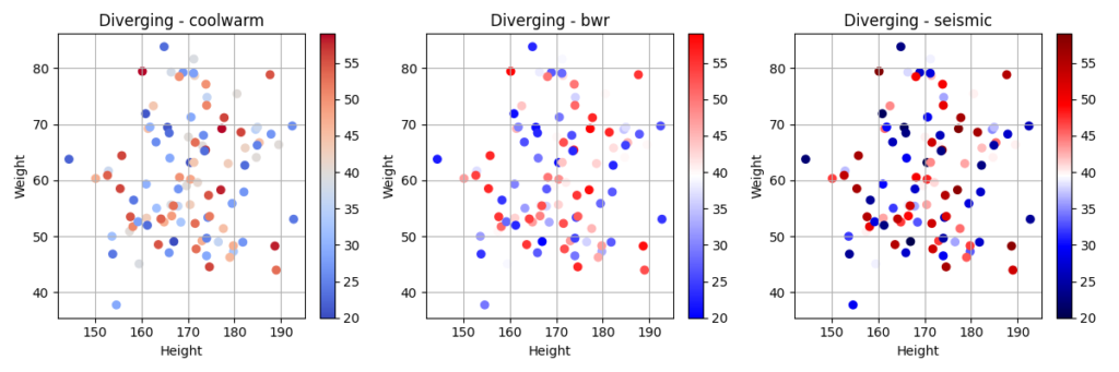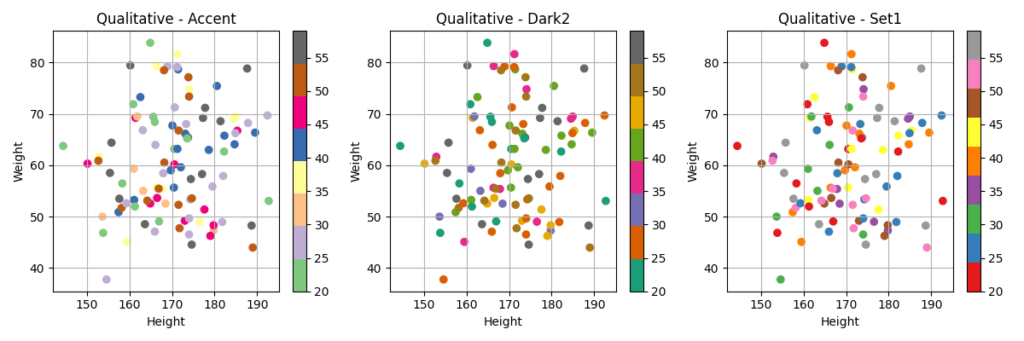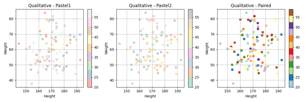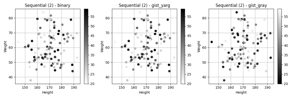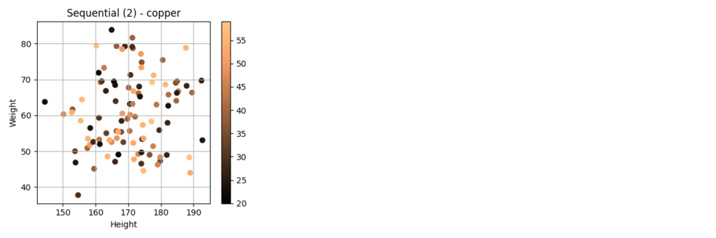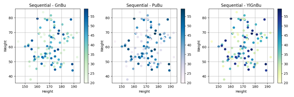 np.random.seed(0): 乱数のシードを固定することで、毎回同じ結果が得られるようにしています。data = ...: 身長、体重、年齢のデータを辞書型で作成しています。df = pd.DataFrame(data): 辞書型のデータをpandasのDataFrameに変換しています。cmaps = ...: 使用するcolormapのリストを作成しています。for i in range(len(cmaps)): colormapのリストをループで処理しています。n_row = ...,n_col = ...: グラフの行数と列数を計算しています。fig, axes = plt.subplots(...): グラフのfigureとaxesを作成しています。if n_row == 1:: axesが1次元配列の場合、2次元配列に変換しています。for j in range(len(cmaps[i][1])): 各colormapをループで処理しています。cmap = ...: 現在のcolormapを取得しています。ax = ...: 現在のaxesを取得しています。scatter = ax.scatter(...): 散布図を作成しています。ax.set_title(...): グラフのタイトルを設定しています。ax.set_xlabel(...),ax.set_ylabel(...): 軸ラベルを設定しています。ax.grid(True): グリッドを表示しています。fig.colorbar(scatter, ax=ax): カラーバーを追加しています。plt.tight_layout(): グラフのレイアウトを調整しています。plt.savefig(...): グラフを画像ファイルとして保存しています。