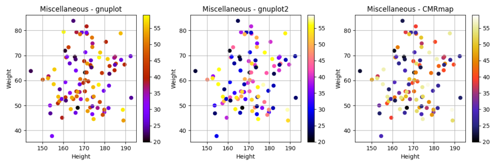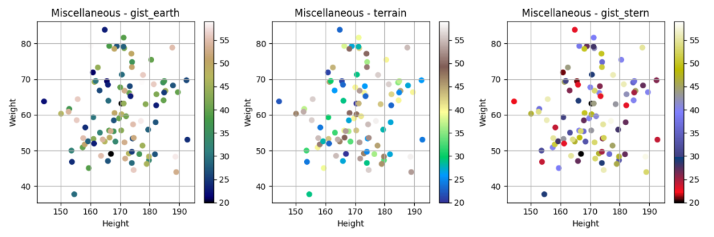 それでは、実際にcolormapを使ってグラフを作成してみましょう。今回は、身長、体重、年齢のデータを使って、年齢を色で表現した散布図を作成します。