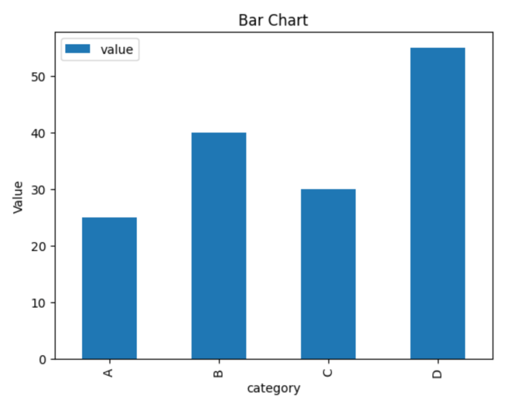 4. 棒グラフの作成: df.plot.bar(x='category', y='value')で棒グラフを作成します。x='category'はx軸にcategory列を使用することを指定し、y='value'はy軸にvalue列を使用することを指定します。