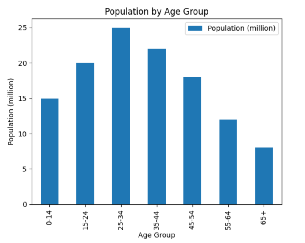 年齢層別の人口を棒グラフで表示することで、人口構成を把握できます。