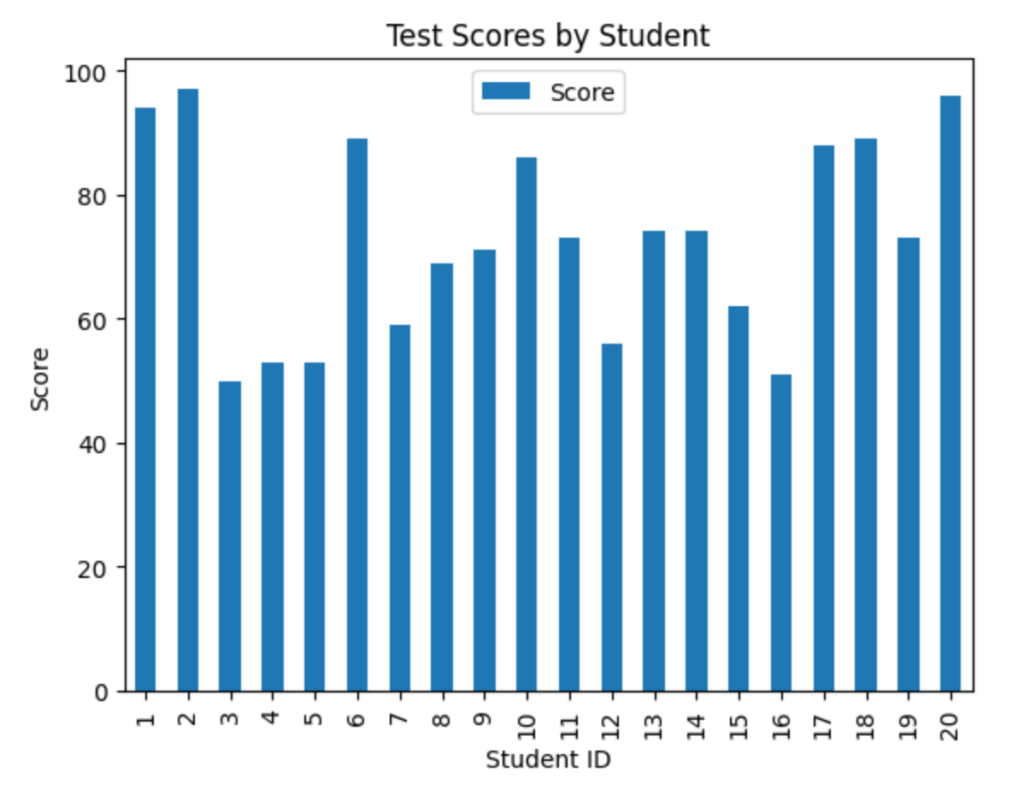 学生のテストの点数を棒グラフで表示することで、得点分布を把握できます。