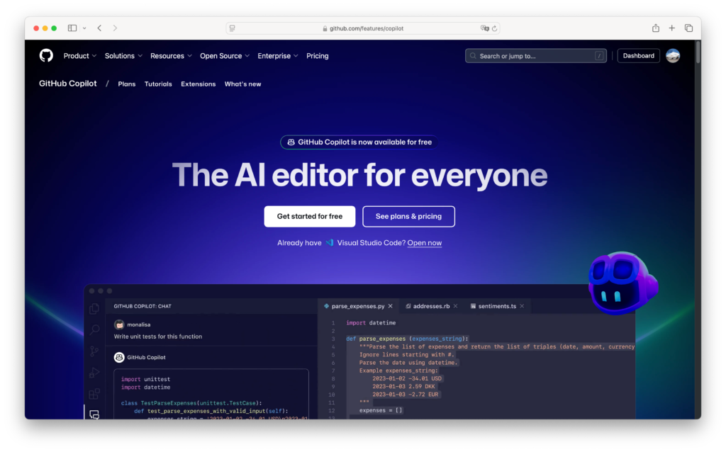 GitHub Copilot · Your AI pair programmerを開きます。下のスクショは12/19にアクセスしました。