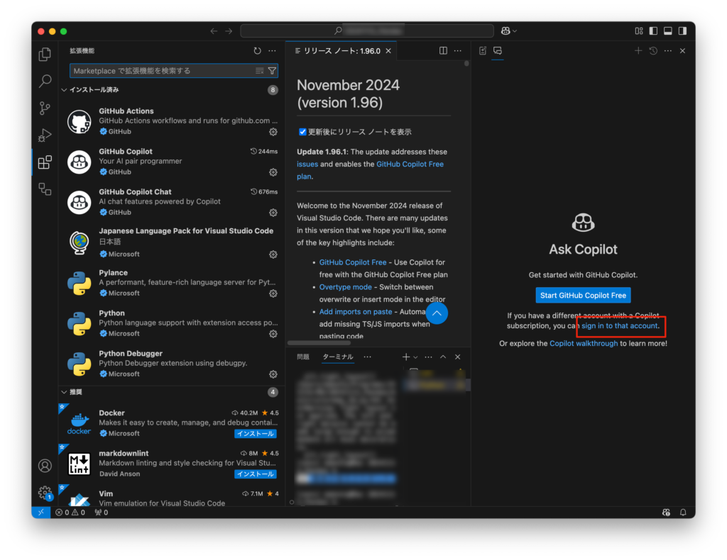 案内に従って、VSCodeの拡張機能である “GitHub Copilot” と “GitHub Copilot Chat” をインストールします。以下のスクショは、インストール完了後の様子です。赤枠で示したとおり、2つの機能拡張がインストールされています。