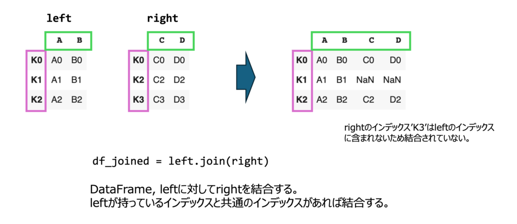 joinは、インデックスをベースにDataFrameを結合するメソッドです。mergeと似ていますが、DataFrameのメソッドであることに注意して下さい。