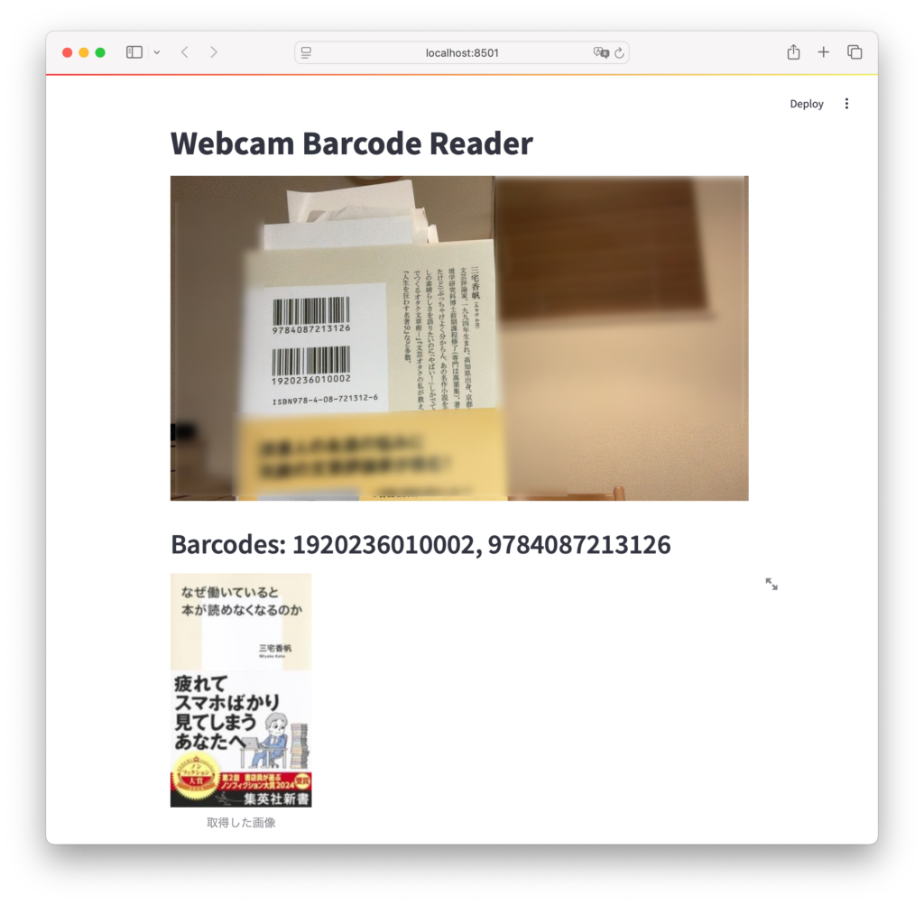 while True: カメラから映像を取得し続けるループです。ret, frame = cap.read(): カメラから1フレームを読み込みます。retは読み込みが成功したかどうかを示すブール値、frameは画像データです。if not ret: break: 読み込みに失敗したらループを終了します。frame = cv2.cvtColor(frame, cv2.COLOR_BGR2RGB): OpenCVはBGRフォーマットで画像を扱うため、Streamlitで表示するためにRGBフォーマットに変換します。try...except: バーコードの検出処理でエラーが発生した場合でもプログラムが停止しないように例外処理を行います。ok, decoded_info, decoded_type, corners = barcode_reader.detectAndDecode(frame): バーコードを検出します。okは検出が成功したかどうかを示すブール値、decoded_infoはバーコードの情報、decoded_typeはバーコードの種類、cornersはバーコードの角の位置情報です。if len(decoded_info) > 2: バーコード情報が有効な場合 (長さ2以上) に処理を行います。detected_codes.add(f'{decoded_info}'): 検出したバーコード情報を集合に追加します。placeholder.image(frame, channels="RGB"): 現在のフレームをプレースホルダーに表示します。if len(detected_codes) >= 2: 2つ以上のバーコードが検出されたらループを終了します。l = list(detected_codes): 検出されたバーコード情報をリストに変換します。st.header(f'Barcodes: {l[0]}, {l[1]}'): 検出された2つのバーコード情報を表示します。for code in detected_codes: 検出されたバーコード情報それぞれに対して処理を行います。isbn_code = None: ISBNコードを格納する変数を初期化します。if '9784' in code: バーコード情報に’9784’が含まれている場合 (日本のISBNコード) を判定します。isbn_code = code: ISBNコードを変数に格納します。