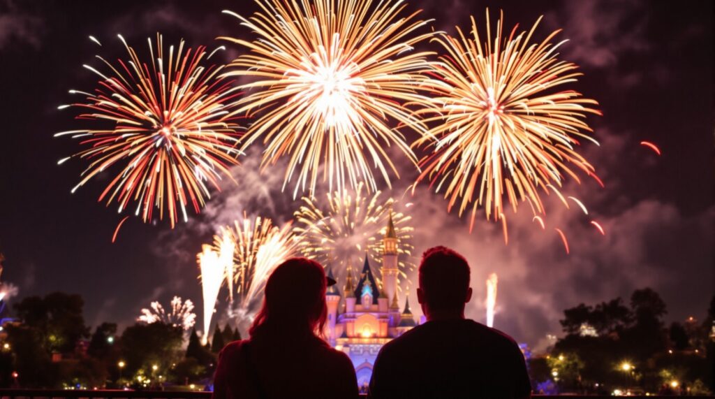 # Two people watching fireworks at Disneyland.出来上がった画像はこちらです。かなり良い仕上がりです。