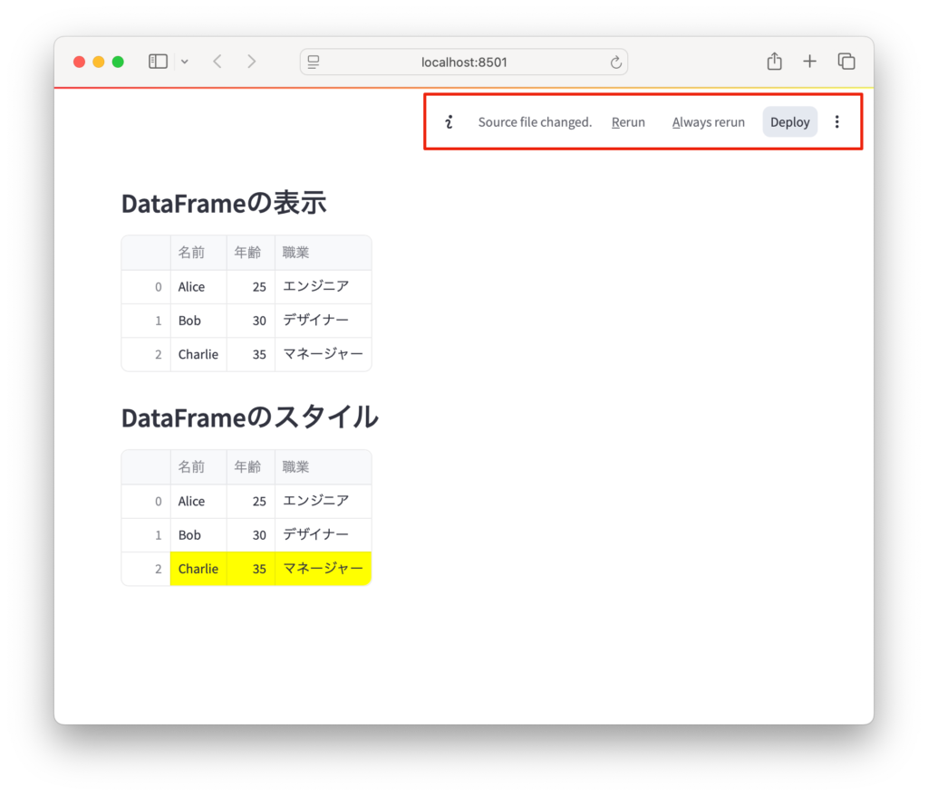 streamlit run app.pyアプリを起動後、エディタでapp.pyのコードを変更して保存すると、自動的にブラウザ側がリロードされ、変更内容が反映されるようになります。