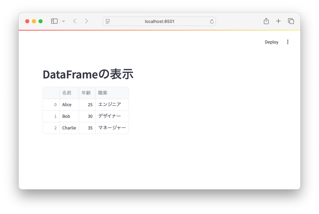 st.tableは、静的なテーブルを表示する関数です。インタラクティブな操作はできませんが、見た目が整った表をきれいに表示できます。