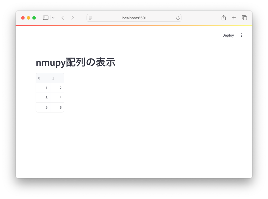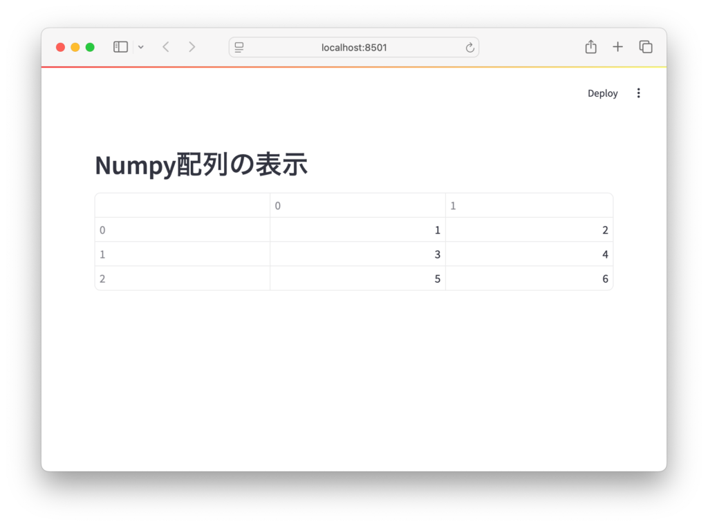 data = np.array([[1, 2], [3, 4], [5, 6]])4. st.dataframe の使い方と特徴