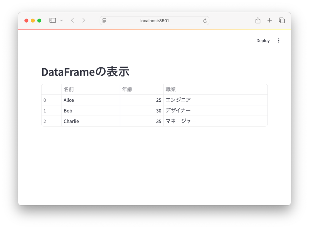st.dataframeは、スクロール・並び替え・列幅の自動調整が可能なインタラクティブな表示用関数です。